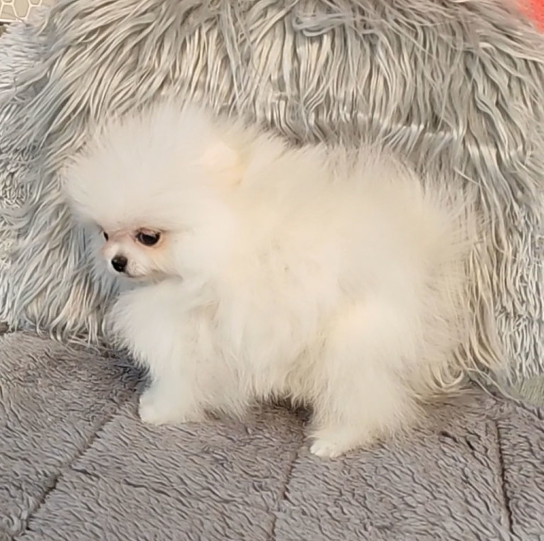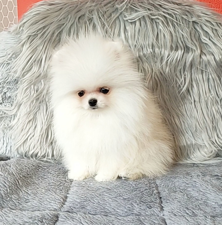 Халиф Красивый миниатюрный светло-кремвый мальчик-померанчик. Маленький «мишка» с коротким, очень курносым носиком. Пушистый. Толстолапый. Настоящий красавец. / Beautiful miniature white pomeranian boy. Small «teddy-bear» with short, very snub nose. Fluffy, with thick paws. Real cutie! Предлагается как домашний любимец. Рост взрослой собаки — 19 см, 2 кг.